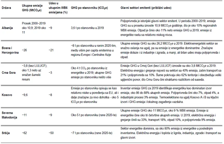 - Emisije su snažno koncentrisane u sektorima povezanima sa energijom. Proizvodnja električne energije i toplote iz uglja, neefikasne zgrade i transport dominiraju, dok industrija i otpad imaju sekundarni, ali važan doprinos. Na primer, na Kosovu oko 86 do 88% emisija dolazi iz energetike, dok u Crnoj Gori električna energija i grejanje čine 40% emisija.